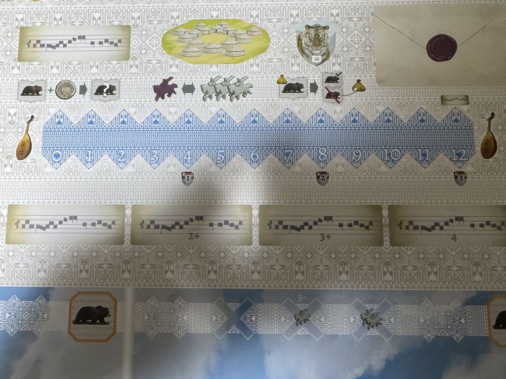 遊んだ感想としては、リソース管理がとても難しい。リソースの種類は毛皮、馬、お金の3種類で、中心となるリソースは毛皮だ。しかし、毛皮には番号が2〜8まで振られており、特定の番号の毛皮が必要になる場面が多く、それをいかに入手するかが問題となる。そこでお金や馬を(ウマだけに)上手く使って毛皮を変換したり入手したりということを行っていくのだ。