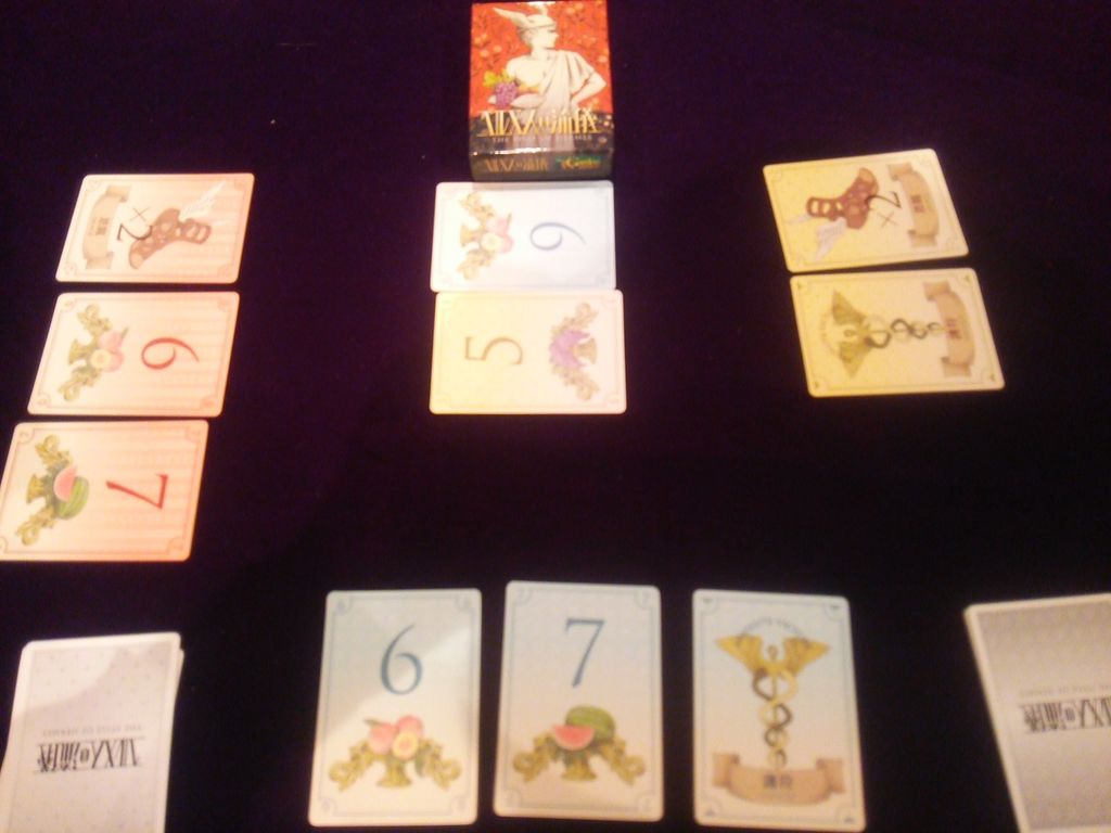 しかも競りが魅力的でないと,必ず競りに勝つカード(ヘルメスの杖)が全員の前にそろってしまい,だれもオークションをスタートしない状況にもなります(入札は1回のみ,しかも開始した人が最後の入札者になり,開始した人より先にヘルメスの杖を使われてしまうため)。で,オークションも供物・資金追加もしないで全員が手番パスするとゲーム終了!おつかれさまでしたー。