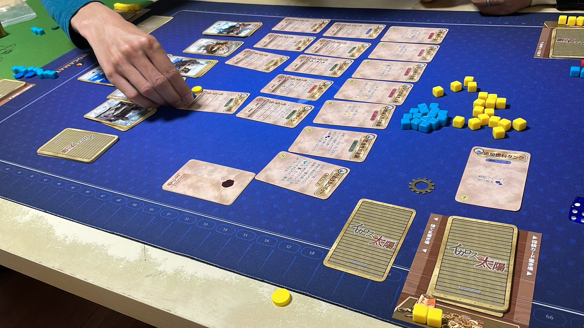 ワーカープレイスメント+デッキ(ルート)構築です。ゲームごとに異なるアクションエリア、得点カードが出てくるため、遊ぶたびに違う展開になります。
