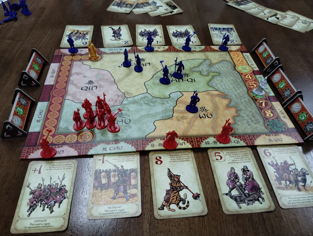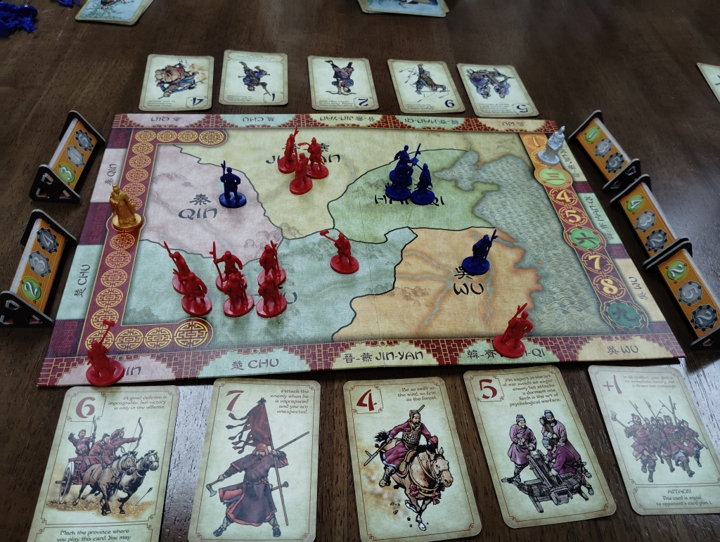 勢力争いは、カードを各地に伏せてから同時に順番に公開していき戦力差だけコマを取り除いたり配置したりしていきます。