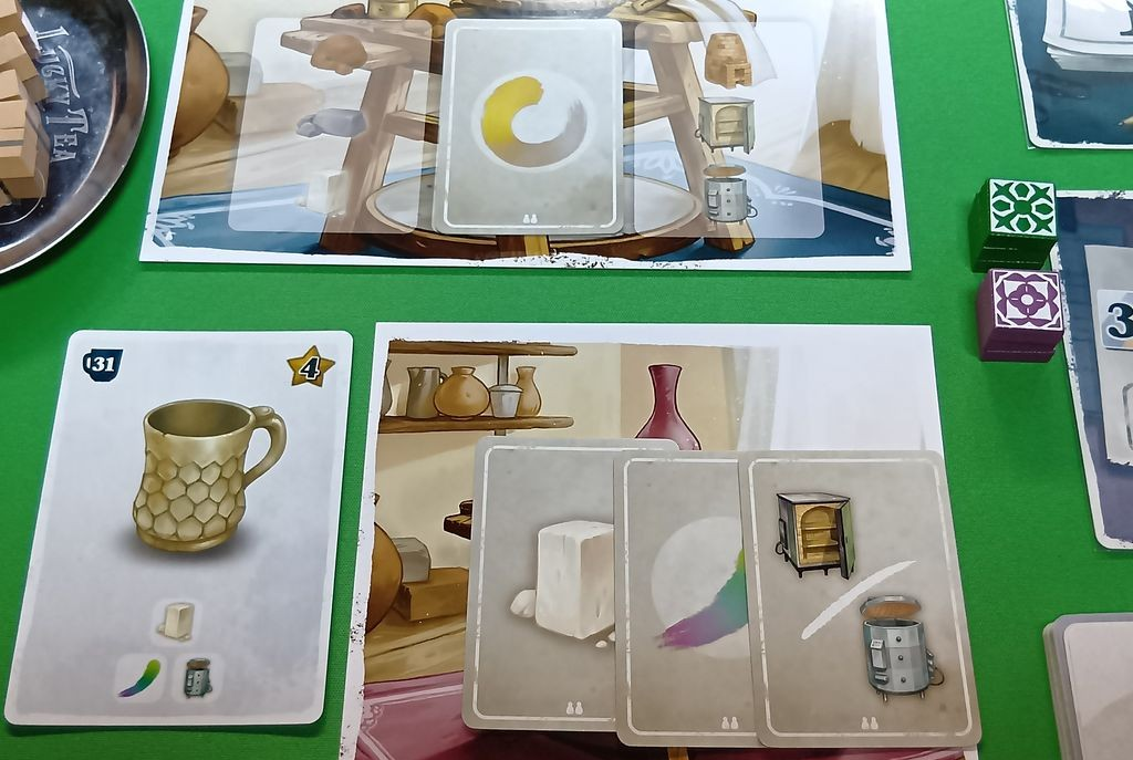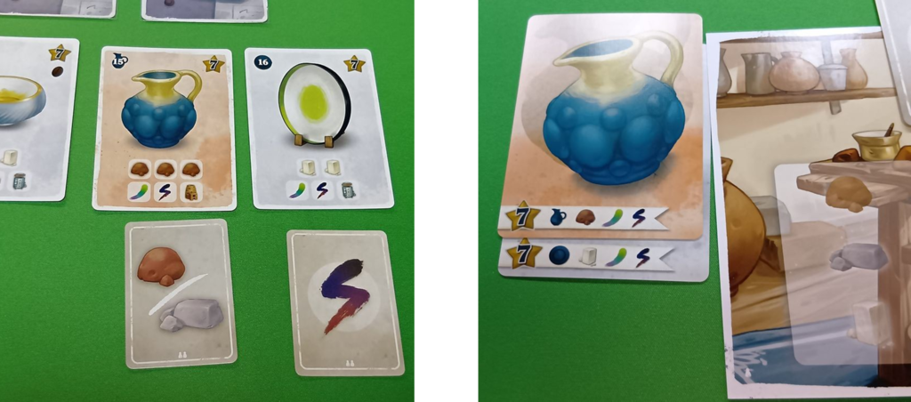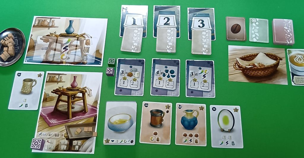 ソロはオートマの「友人」との(結果的に)対戦。陶芸を教えて欲しいという友人と素材を分け合いながら、多くの作品を作ります。友人は専用ボードやカードを使い、こちらのアクションに応じた特殊な動きをしてきますが、その動きによっては必要素材を確保できたりします。複数人プレイと同じように3ラウンドプレイして、得点の高い方が勝利します。