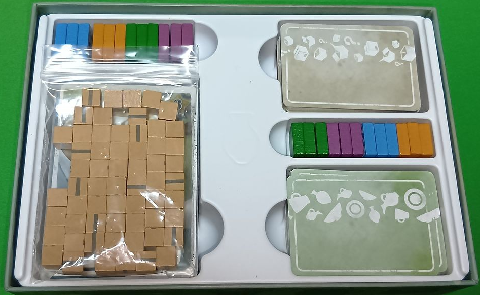 収納:日本語版が出ている「ハーベイシャス」「フロリフェラス」と同じように、プラ製インサートが入っていて仕分けはとてもきれい。ただしスリーブはつけられないくらいのサイズ。カードの質は悪くないのが救いですが、せめて乾燥剤が入る余地は欲しかったかな。↓こんな感じ。これで上にボードと取説が乗ります。