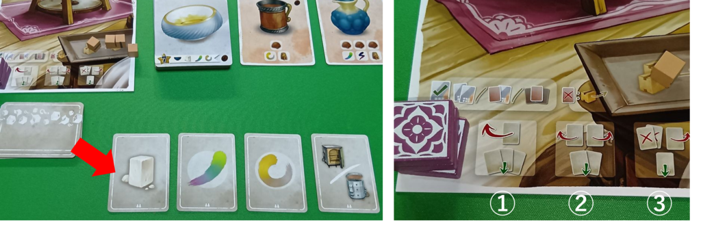 ③自分の獲得したリソースカードをを作品に振り分けたり資源トークンに変換したりする。作品が完成したら裏返して、作品カードやアドバンテージカードを獲得する。