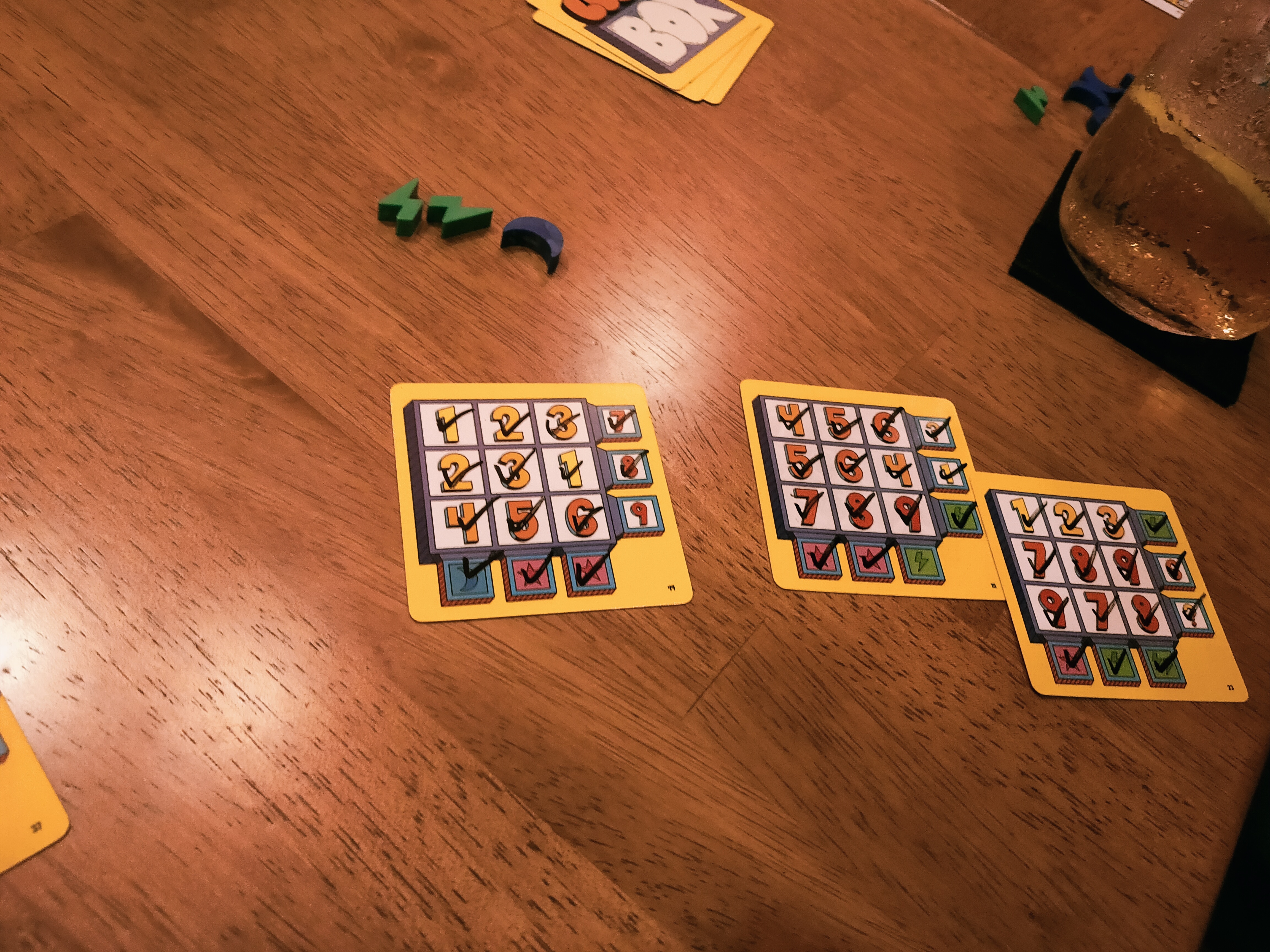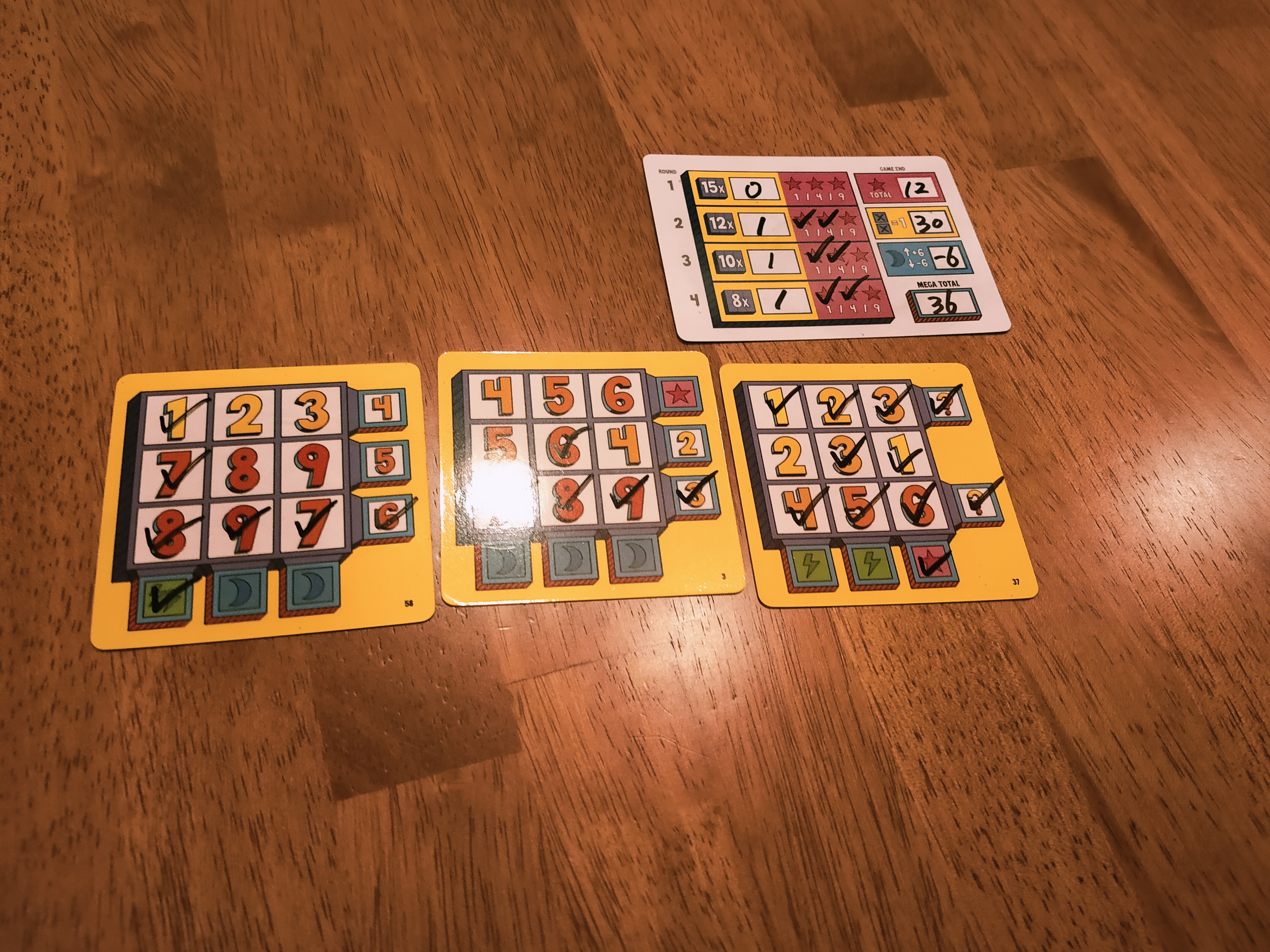 1ラウンド目でビンゴカードを完成させる(まあほぼ無理)と15点、2ラウンド目で12点、とだんだん減っていくのですが、ビンゴカードを完成させるか、それとも行列完成でボーナスを狙ってコンボをするのか悩みます。避けるべきは、数字をめくったときに塗れないということをできるだけ避けること。無駄手になってしまいます。
