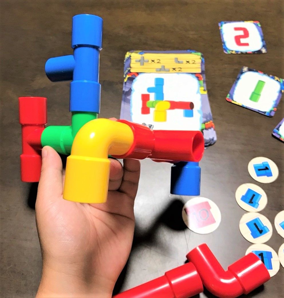 お題の通りにパイプをつなげて、早いもの順で1,2,3のタイルを取ります。合っていたら、1位から順に得点、というゲームです。