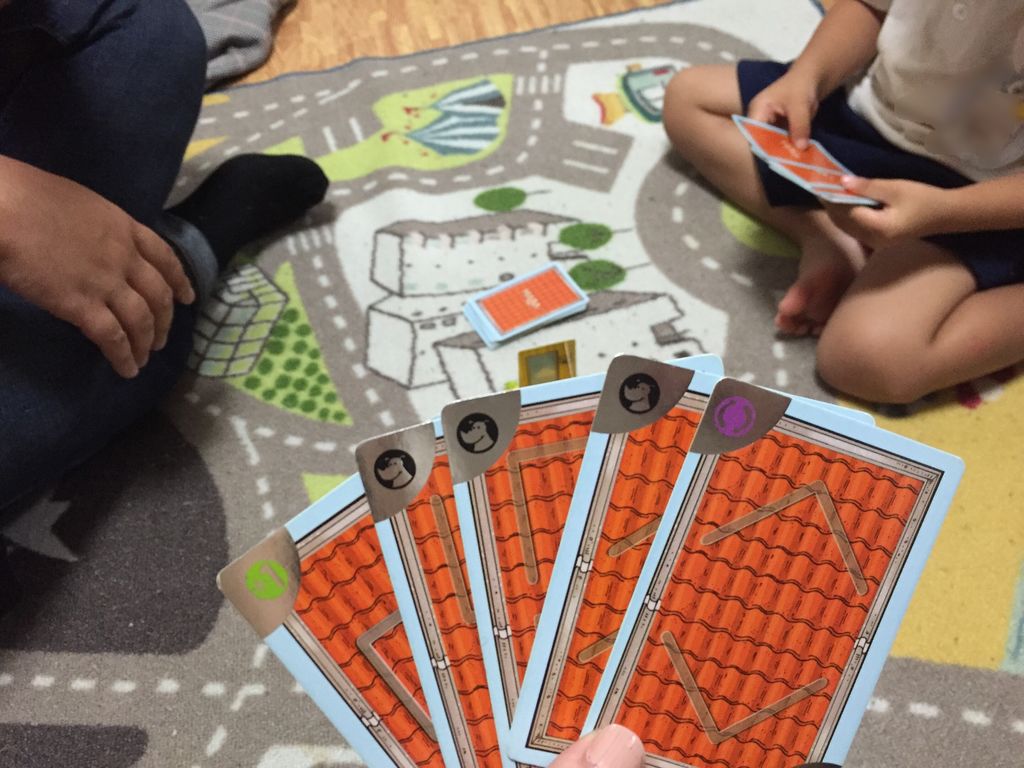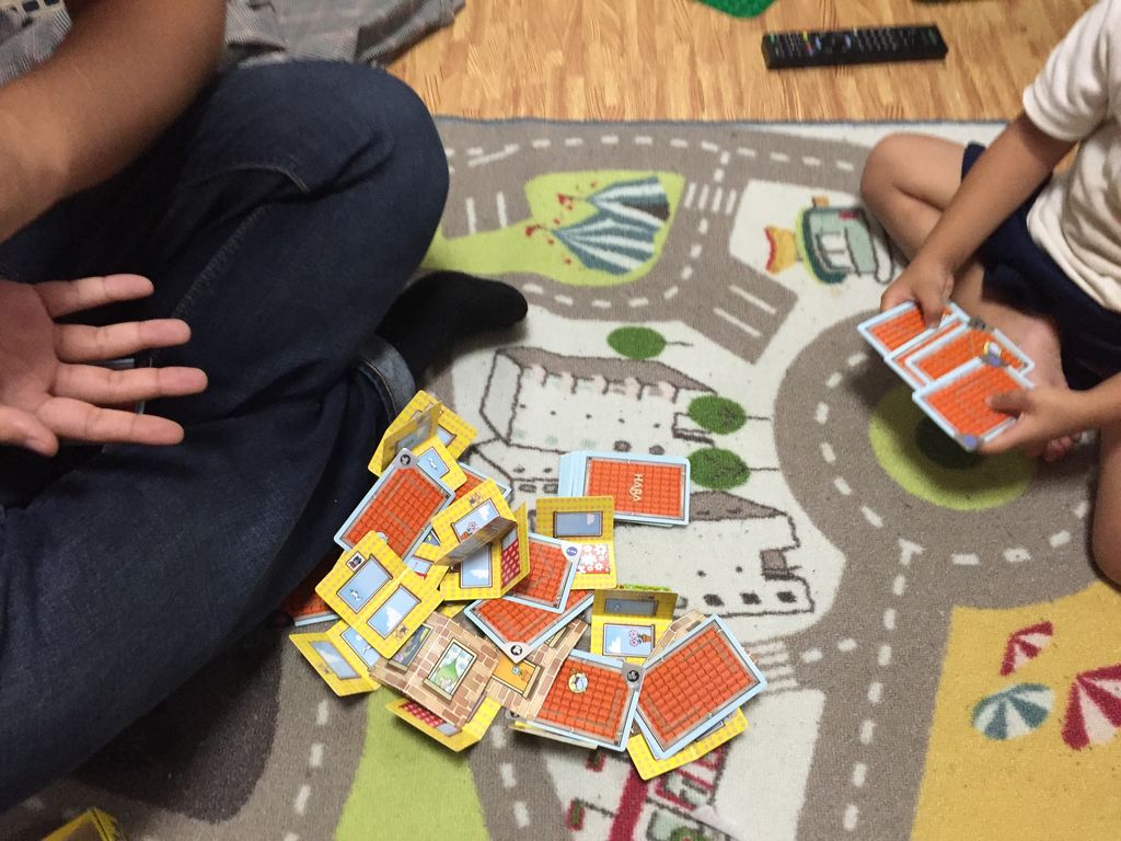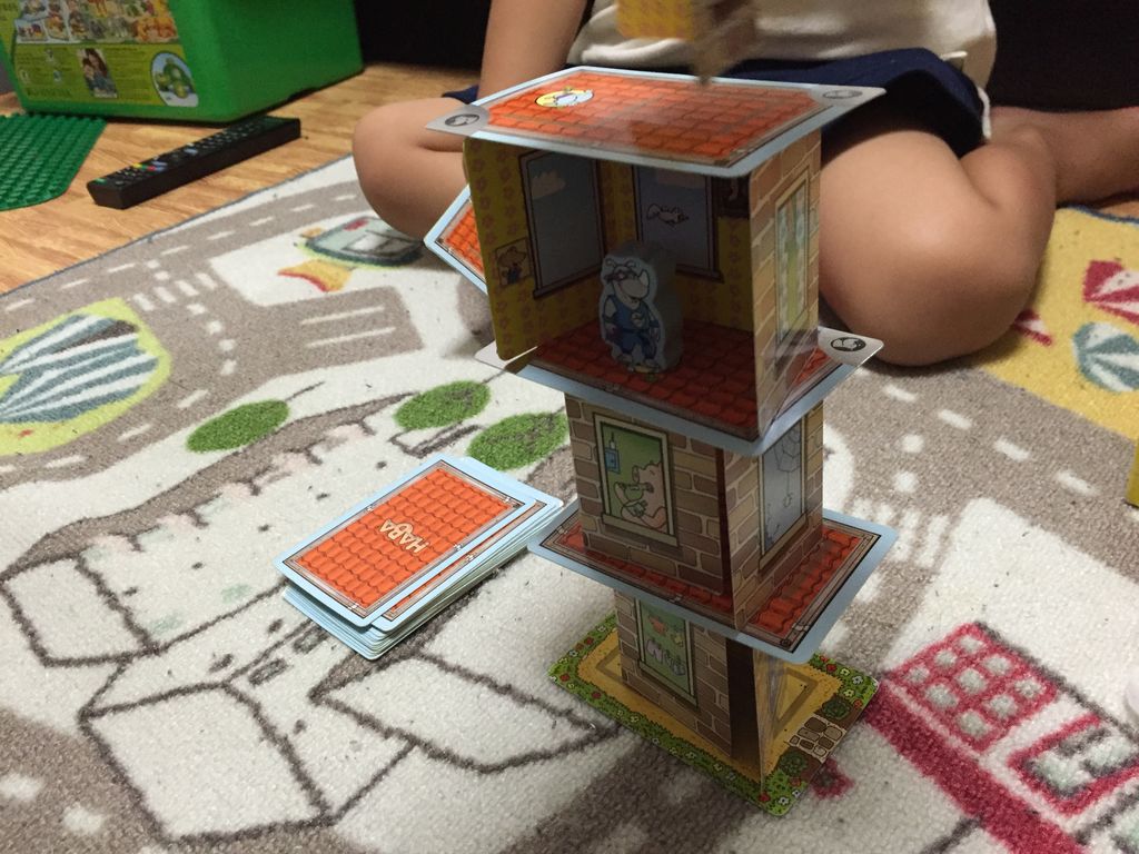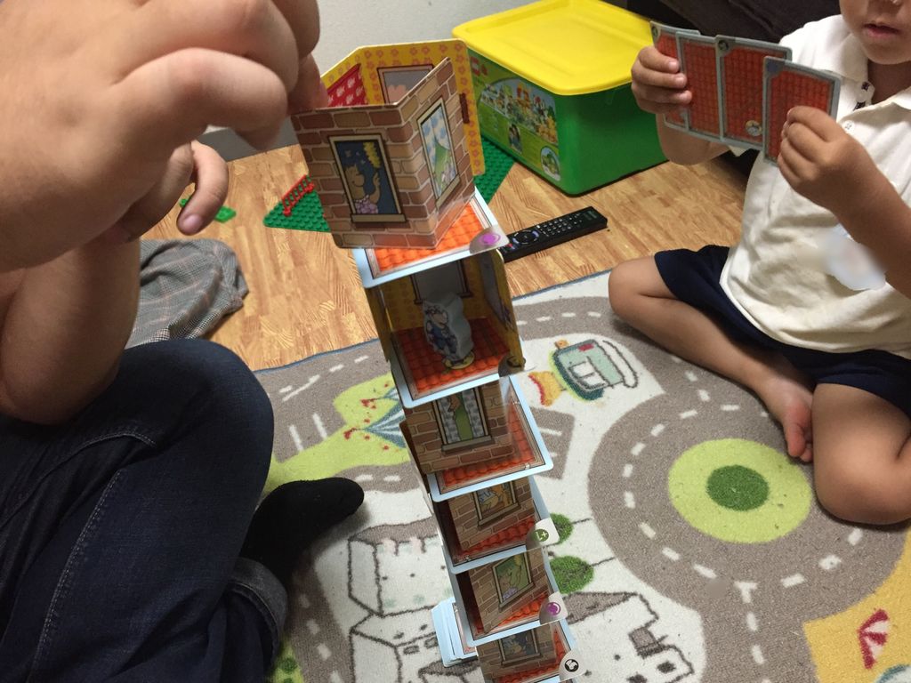 ゲームには勝ったけど息子は少し遊び足りなかったようなので、この後はみんなで協力してカードを高く積み上げるというルールでゲームを続行しました。