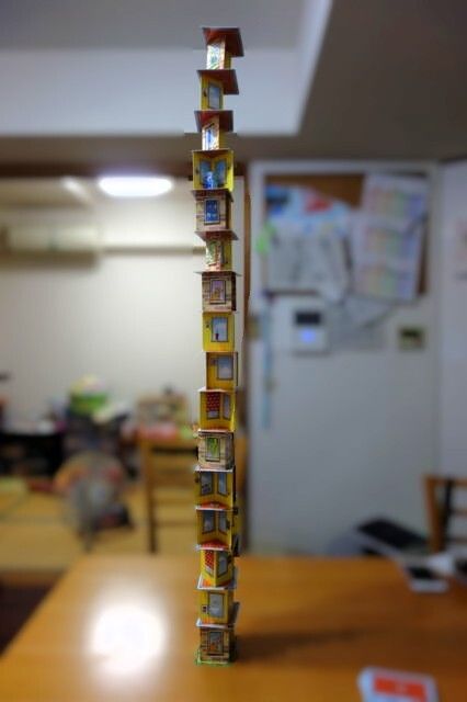このゲームは5歳から99歳(!)まで、となっているが、ご老人には手が震えて無理では、、、でも基本的には、ちっちゃい子でも誰でも気軽に楽しめる。高層マンションが(悲鳴とともに)崩壊するのは壮観だ。紙だけでよくこんなの考えたよなー。