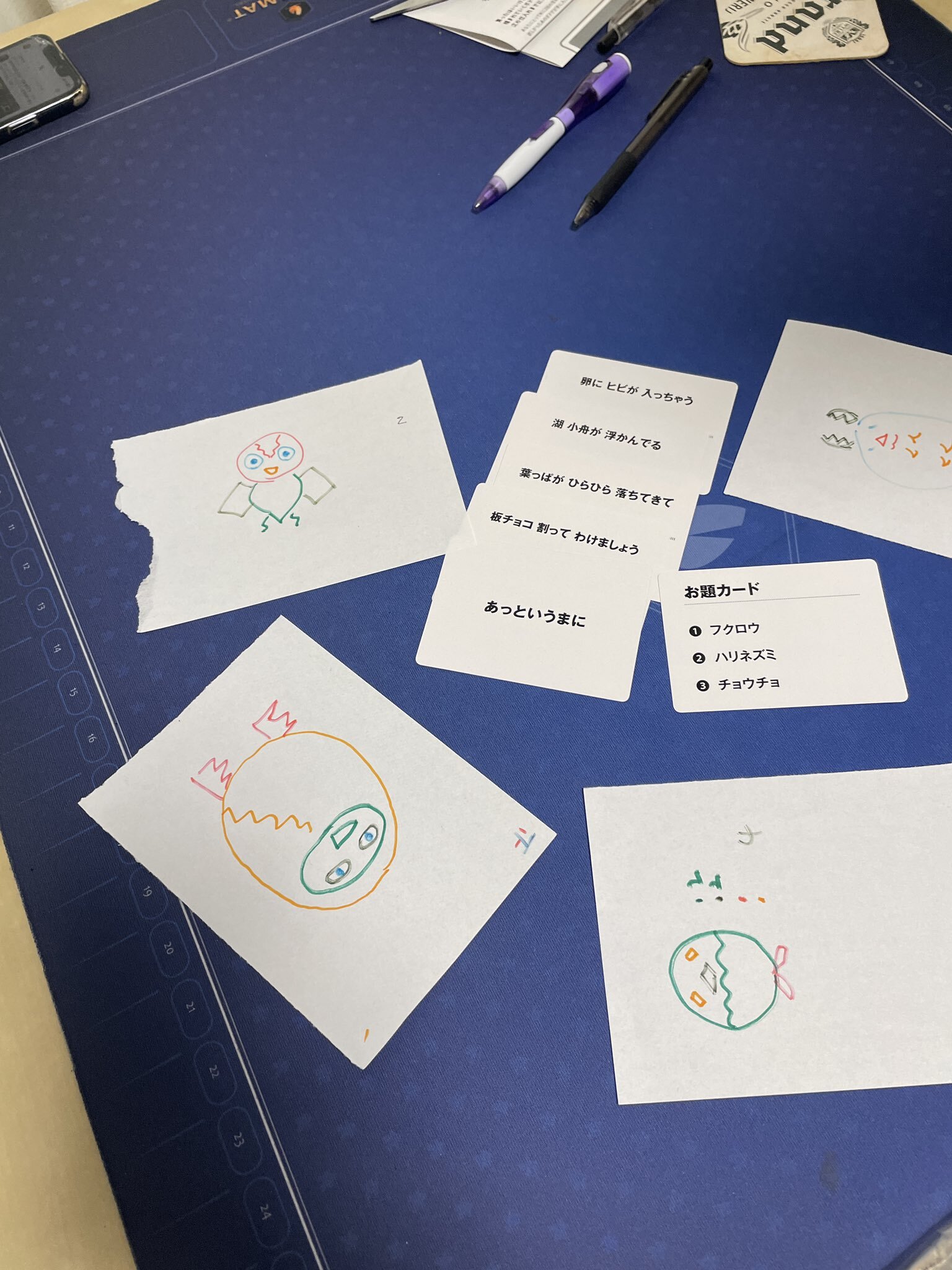 そして、絵描き歌のカードを5枚引いて、4枚でお題のカードを作れるように作って並べます。