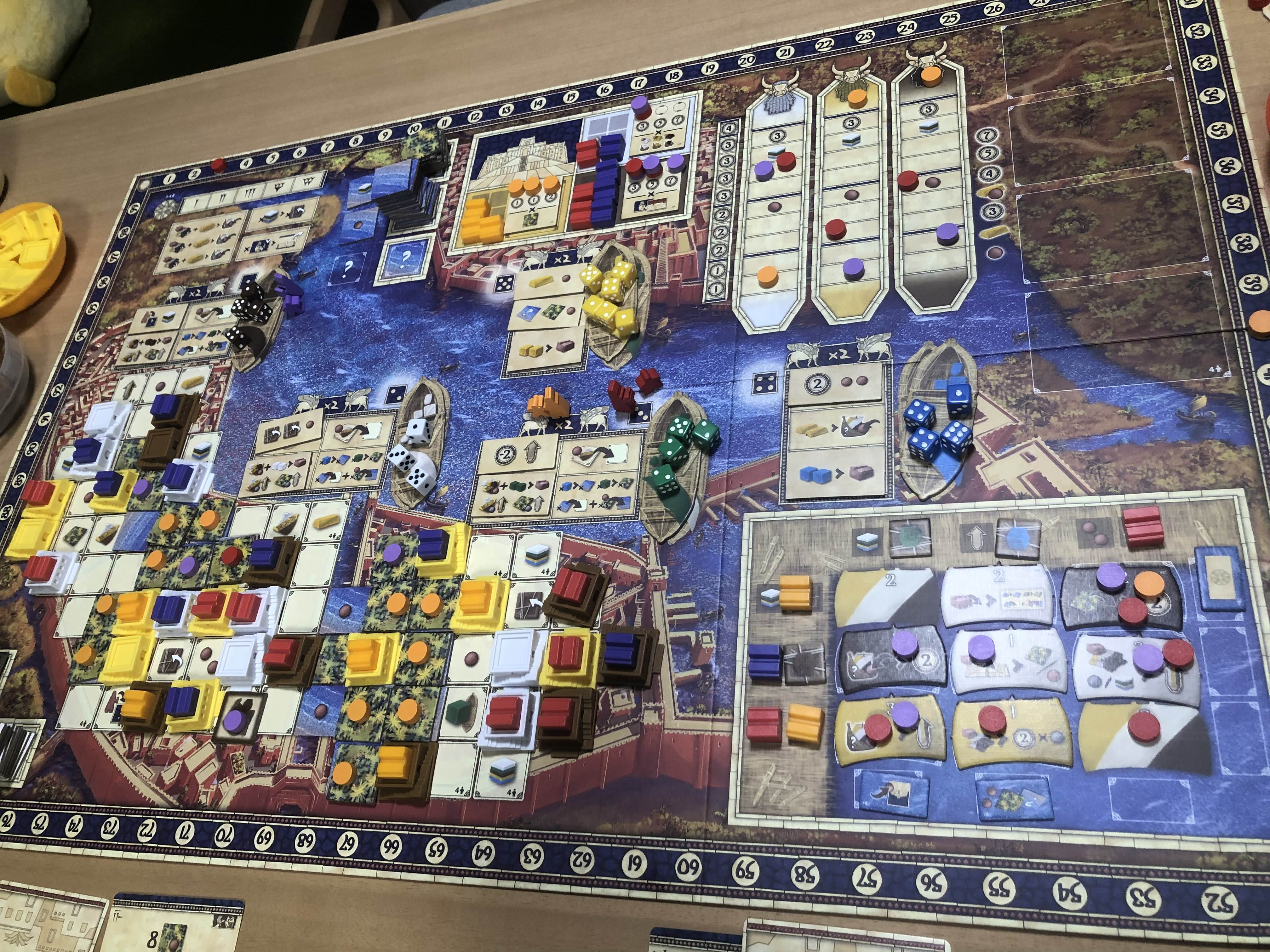 プレイ時間は120分以上はかかる重量級ゲームですが、やること自体ははとてもシンプルです。「ダイスを取って、2アクションする」だけです。最初は少し癖のあるルールに戸惑うかもしれませんが、慣れてしまえば流れはスムーズで、考える楽しさがぐっと増してきます。