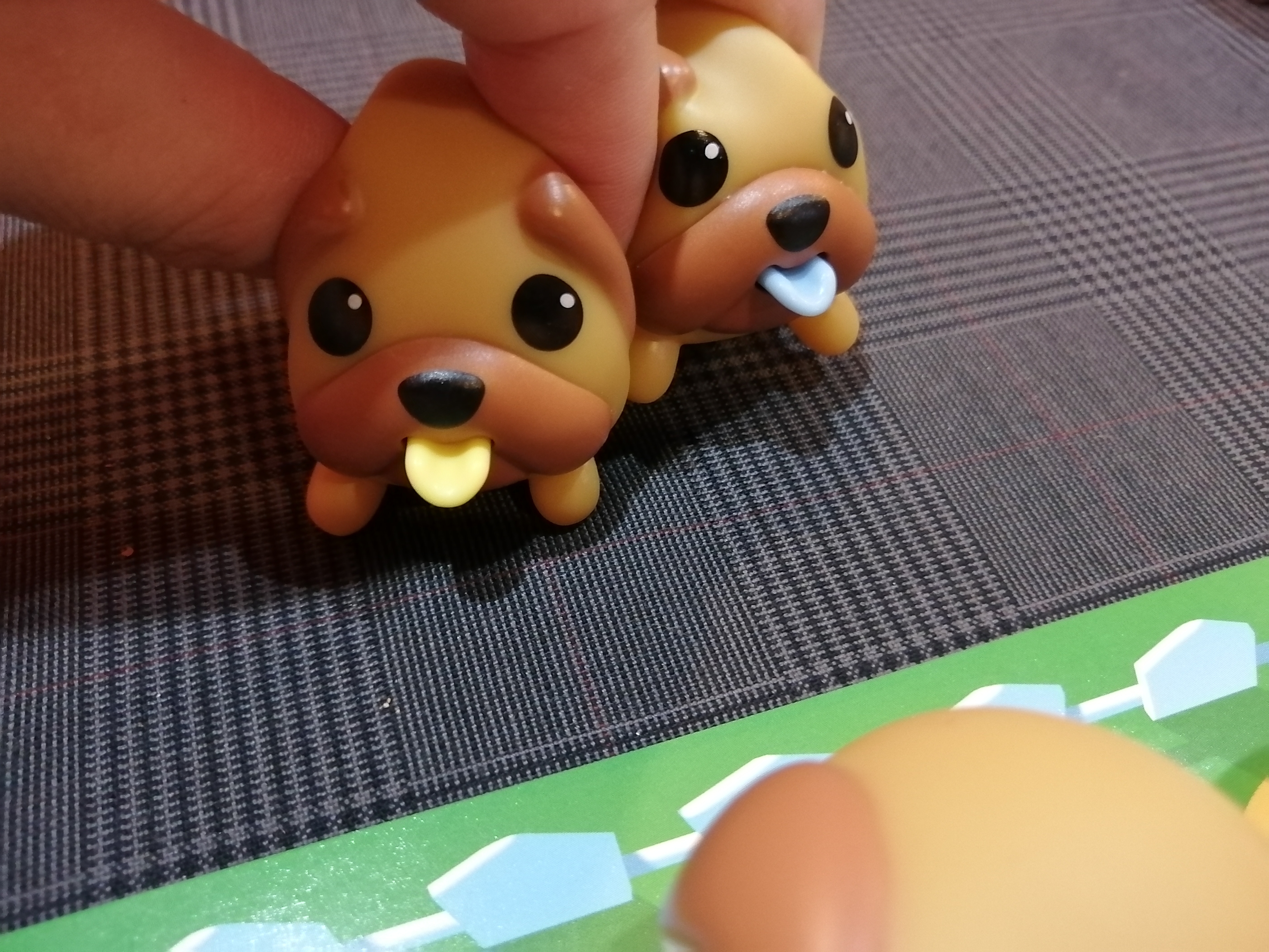 他プレイヤーの個人ボードに配置されているパグを押して、舌の色が当たれば自分の個人ボードに配置できるので、どのパグがどこにいるかを覚えておくことが大切。