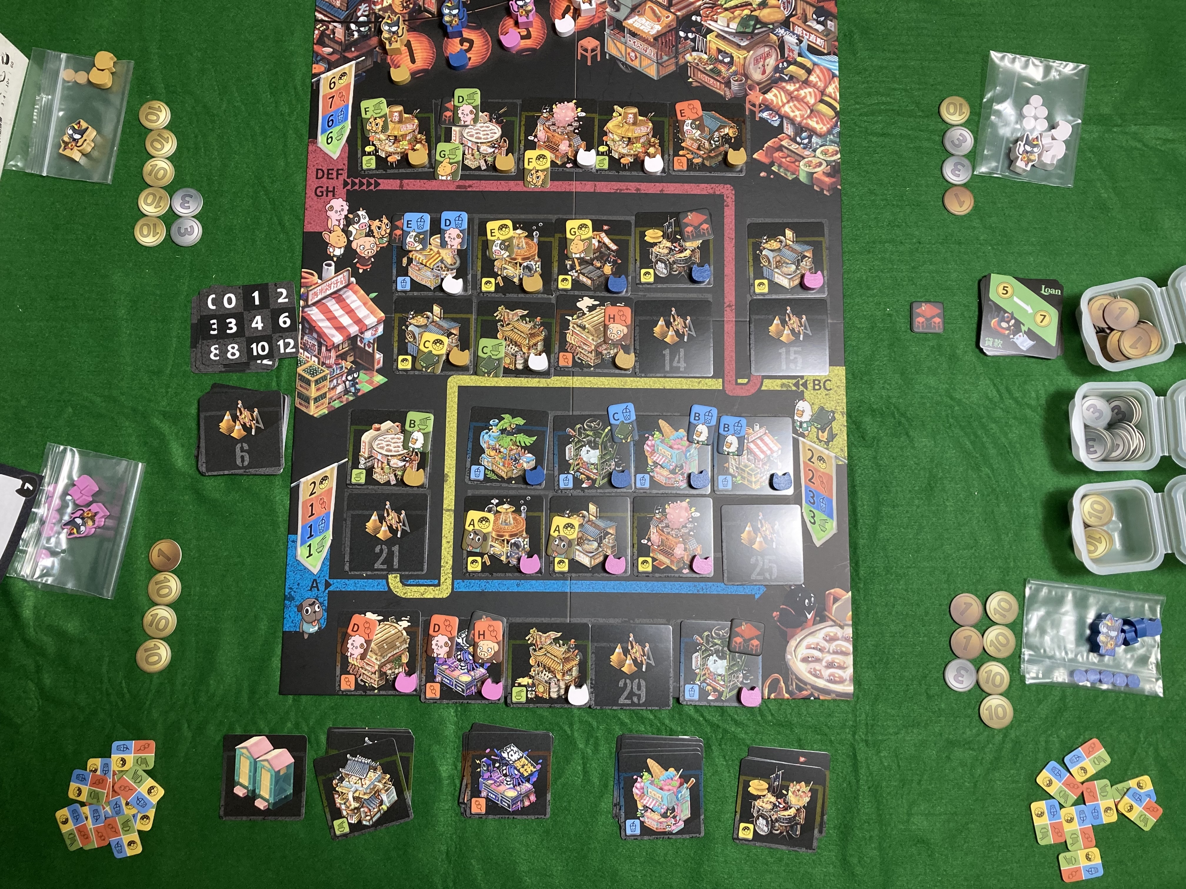毎ラウンドごとに、シャッフルしといた区画カードから規定枚数を引いて表にし、その区画のなかで好きな場所をスタートプレイヤーから順番に競る。2巡して競り終わったら高い金額をつけたプレーヤーが手持ち金から支払いその区画に屋台を設置する。屋台もお客さんも色が4種類あるので訪れるお客さんに合わせて屋台を建設、その後お客さんがアルファベットに対応した入口から決まった流れに沿って屋台に入っていく。お客さんが入った屋台は収入獲得、その後お客さんの補充、手番順序変更を行って次のラウンドへを繰り返していきお金1番稼ぐ感じ。