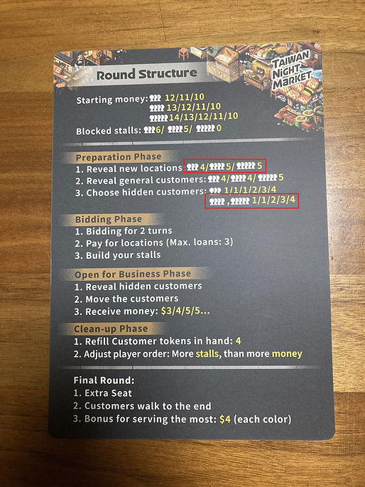 また、ラウンドごとに選択する非公開の客タイルの枚数が、4・5人プレーでは1/1/2/3/4と記載されていますが、正しくは1/1/1/2/4です。この点はサマリーカードのみの誤りで、説明書には正しく記載されています。