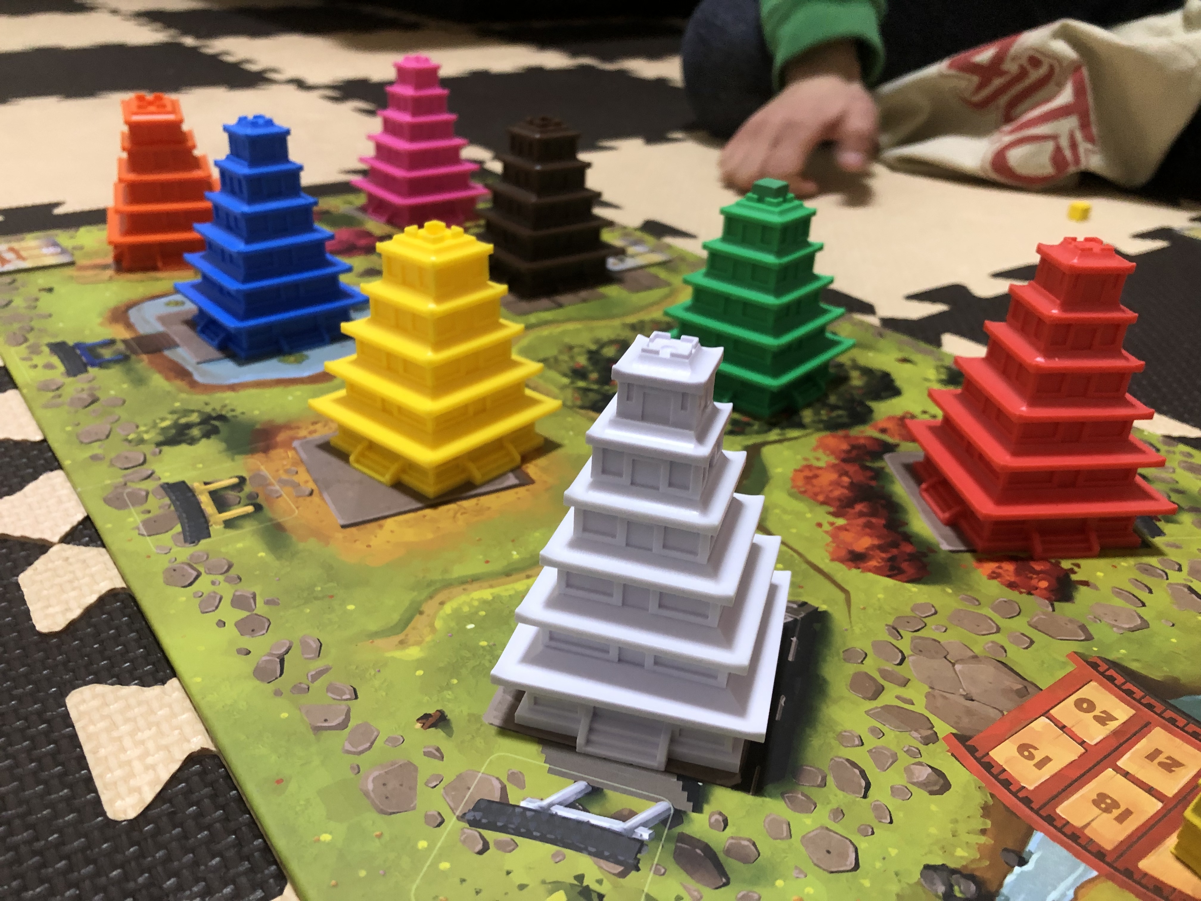 瞑想ポイントをお金という扱いにしたらとっつきやすかったらしく、すぐに理解できて楽しく遊んでいた。塔の各階は、袋に手を入れて引くのだが、上層階になってコマが小さくなると、区別がやや難しかったようだった。