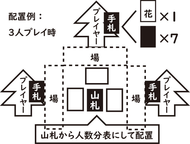 ②カードから、「花」をプレイヤー人数分取り分け全員に「花」を1枚ずつ配ります。残りのカードは、よく切り混ぜてから7枚ずつ全員に配ります。余ったカードはテーブルの中央に配置し「山札」にします。