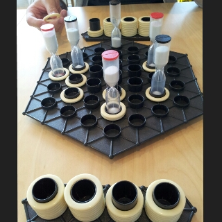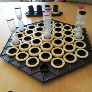 砂時計を移動させてできるだけリングをたくさん配置したプレイヤーが勝ちになりますが、リングは真ん中にいくほど、たくさんリングを配置できるようになります。