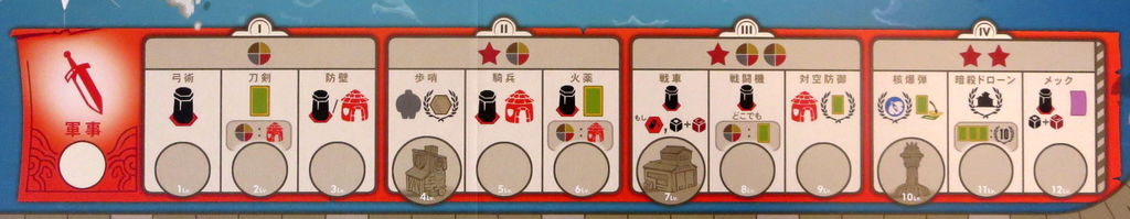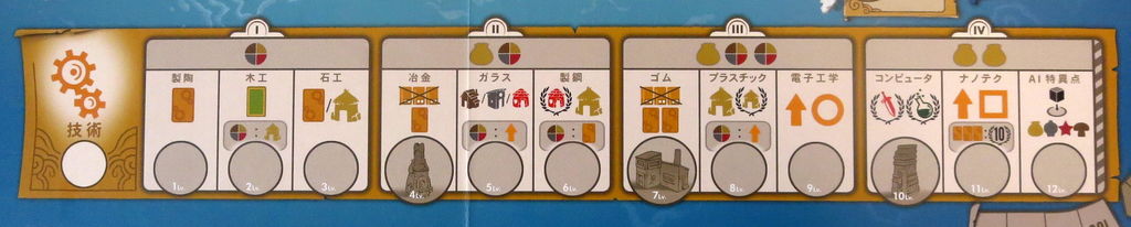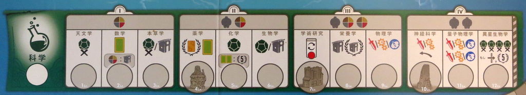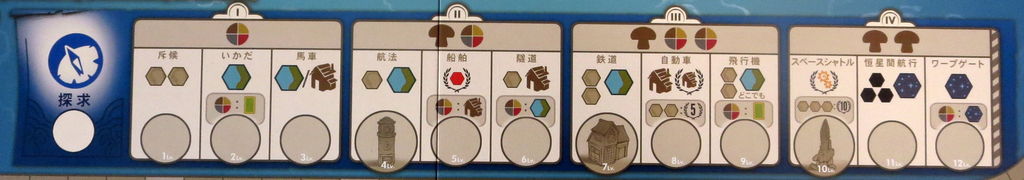 ・メイン・ボードの4辺には探求,科学,軍事,技術の4つの分野の〇進歩トラックがあります。進歩手番を行うというのは,たとえば探求の進歩トラックのいちばん左にある自分の〇キューブを1つ右の円の中に移動することです。移動した円はローマ数字のⅠのランクtierの中にあり,最初は レベル1の斥候(せっこうscouting),次はレベル2のいかだですが,ランクⅣにはレベル10のスペースシャトル,レベル12のワープゲートがあります。レベル12に達することを,進歩トラックを〇極めるcompleteと言います。