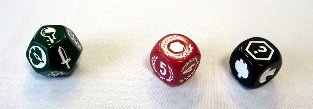 ・次に赤と黒の〇征服ダイスを振って,どちらかの目を採用します。赤のダイスの目はVP4~7です。ヘックスの絵は自分が支配している地域の数に等しいVPを得ます。黒ダイスの目は資源です。?はその地域タイルに描いてある報酬です。待ち伏せされて征服が失敗してもダイスを振れます。