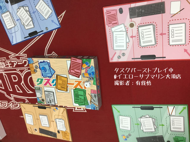 で、実際のプレイ感はどうかと言いますと(5人プレイでした)説明書の記載の処理順が若干曖昧で、タスクバーストが起こった場合の処理はどういう順序で処理されるのかとかが怪しい状態で、勝手にこちらで判断してプレイしておりました。取りあえず手元の色のカードを減らすのが大事なんですが、自分の前の特定の山に自分の色のカードを偏らせて、一気に他人に押しつけるのが攻略法っぽいです。なので、バーストを自分で起こすより起こされる方が面倒くさいのかな? という感じがします。(全部の自分のテーブルボードの山に、自分の色のカードが一枚ずつ置かれてしまうため)
