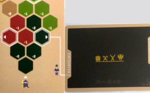 ・マップカード3枚をベージュの面を表にして縦につなげて地図とします。これを場の3列目に置きます。下方に杖を持った魔法使いがいてこれがプレイヤー自身。上方に魔王がいます。裏面は灰色の地図で2枚だけの短い地図になっていますが,別の形のゲームで使うのでしょう。