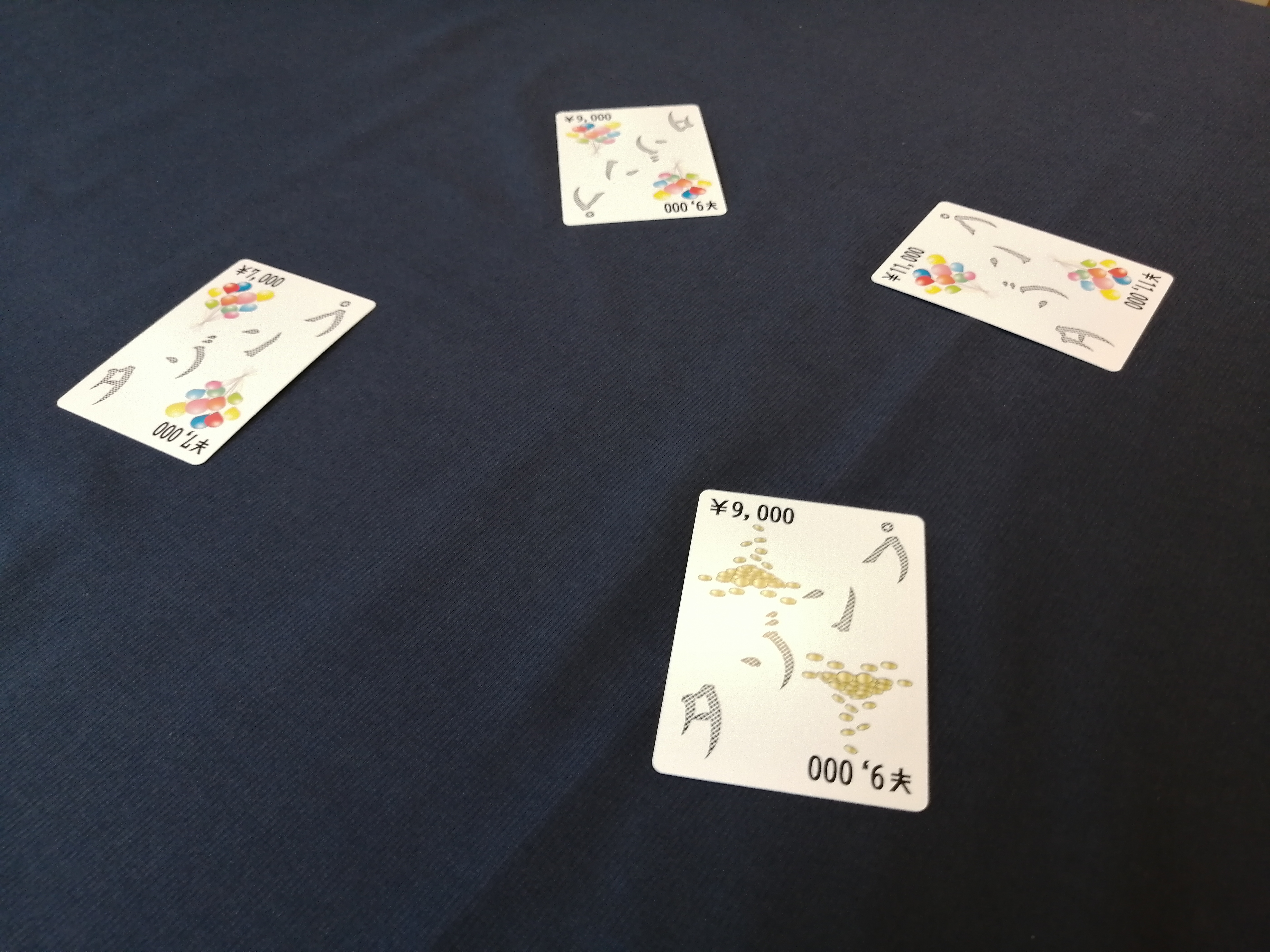 少数派(金額合計が負けている)にならないように読み合いがあるけど、実は流れもできていたっぽいのを感じれず初期金より減って終わりました。配られるカード運はありますけど、2〜6人で遊べてオススメは4〜6人のゲームでした。