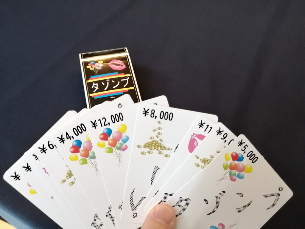 所持金10万スタートで、ゲーム終了時に所持金が多いプレイヤーが勝ち。キス、風船、金の3種のカードがあり、各種1000〜15000、20000の金額になっています。