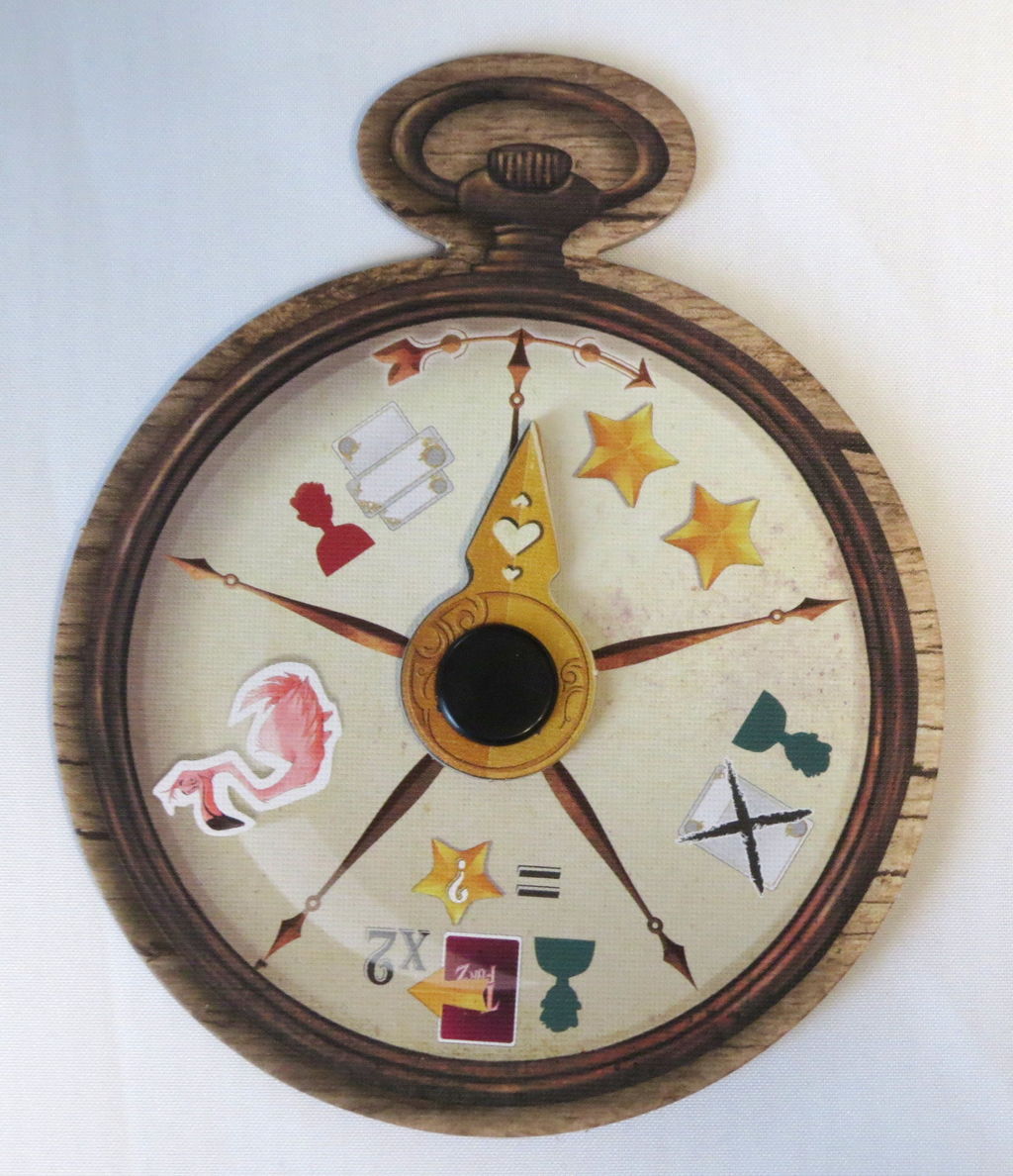 アクションを行った後,懐中時計の針を回すことができます。自分が持っている砂時計トークン(ゲームの最初は0枚です)を何枚か出して,出した枚数だけ針を時計周りに回して,そこに描かれている効果を使います。使った砂時計は共通のストックに戻します。