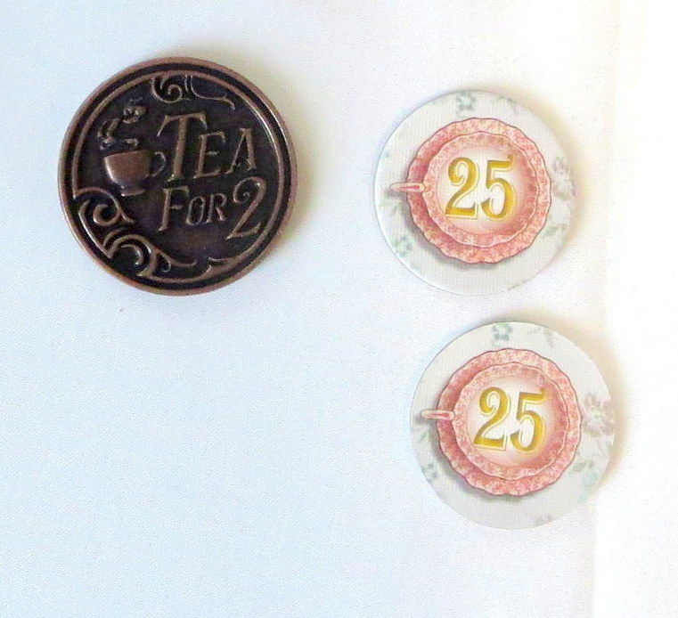 6.ティー・カップ(25と書いてある)2枚は得点ボードの25のところに置きます。得点が25点になったら,ティー・カップをもらって得点コマを0の位置に戻します。