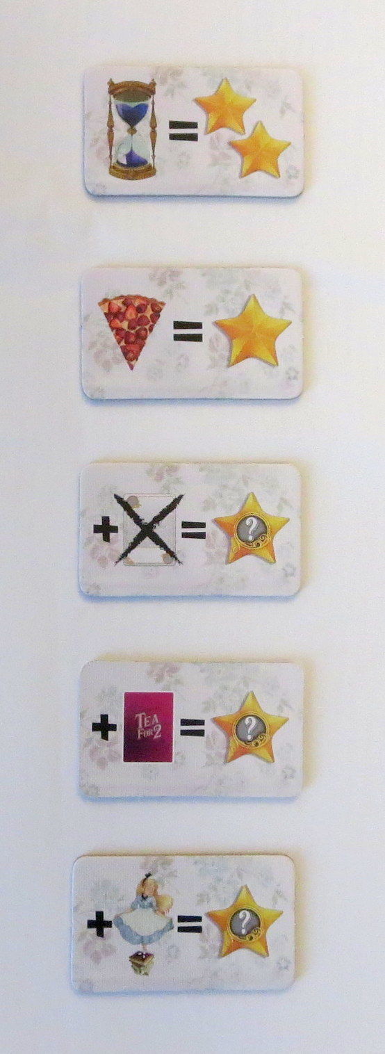 カードの右上や懐中時計に星が付いています。これは得点を表しています。ゲーム中いろいろな方法で得点を得たら得点ボードでコマを進めます。ゲーム終了時には別にボーナス・ポイントがあり,その分だけ得点コマを進めます。コマが最も進んでいるプレイヤーがゲームに勝利します。