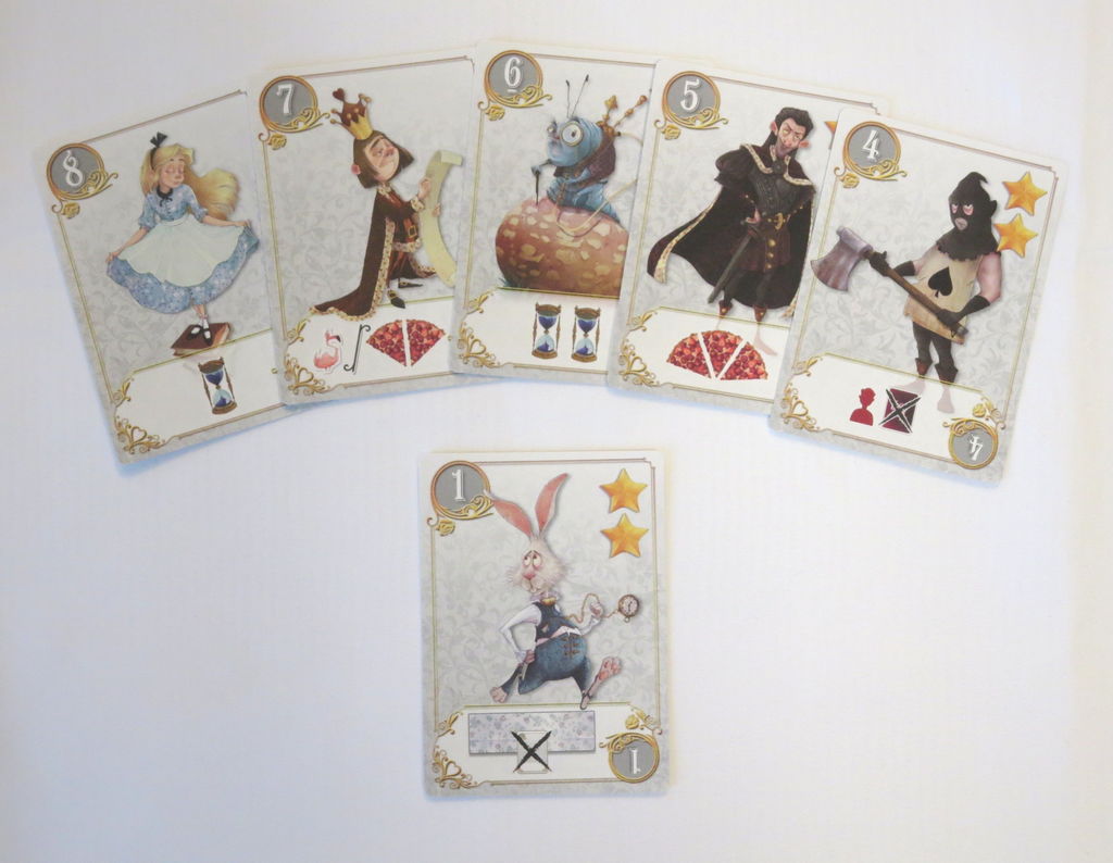 4.地が灰色のカードは2人共通のキャラクター・カードで左上の数字で分類し,それぞれシャッフルして,4~8は得点ボードの下方に表向きの山として置きます。同じ絵のカードでも星の数が違います。これは2人共通の山札です。キャラクター・カードの1はウサギで,得点ボードの下方やや離れた場所に置いておきます。ウサギはみんな同じカードです。