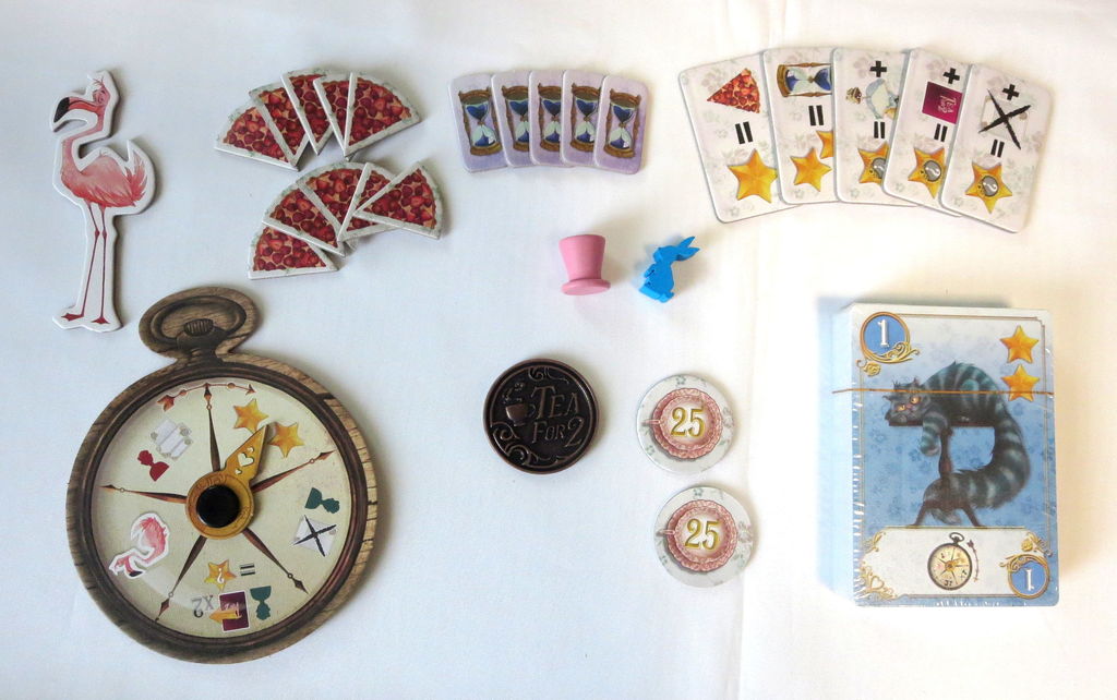 2.プレイヤーは自分の色(青または赤)を選びます。得点ボードの両端に青と赤があるので,自分の色の側にすわります。青プレイヤーは三月うさぎ,赤プレイヤーはいかれ帽子屋が得点コマです。それを得点ボードの0に置きます。