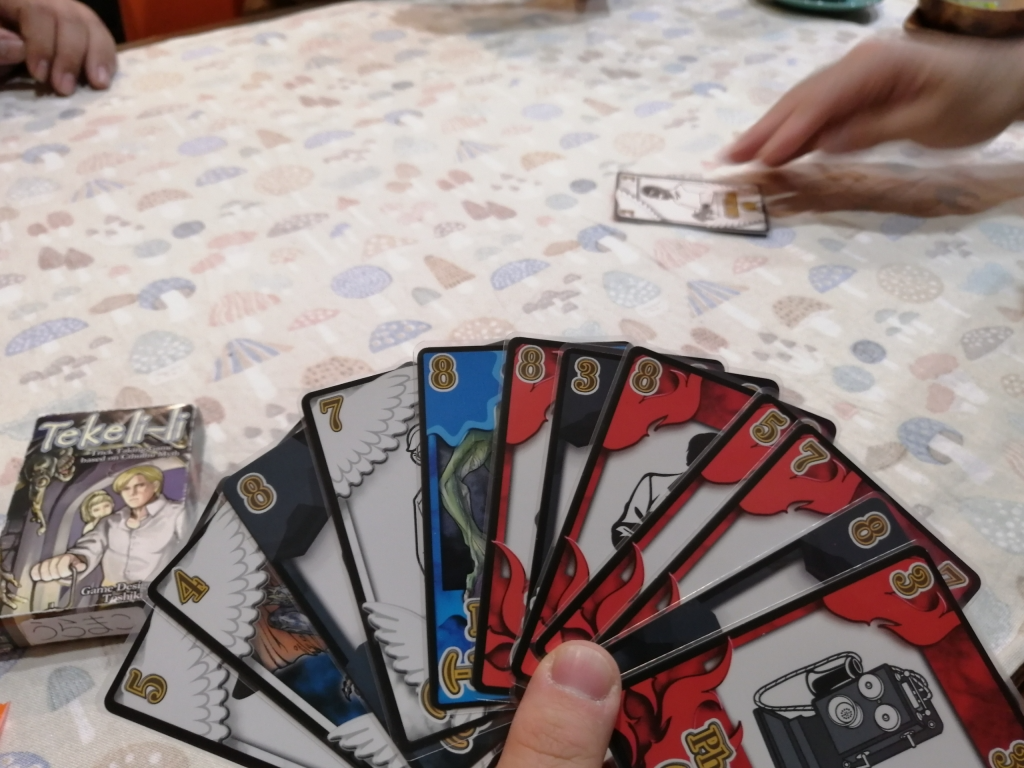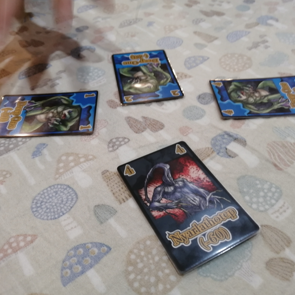 マストフォローのバッティングありのクトゥルフ系トリックテイキングゲーム。4色1〜6の数字カード各1枚、7〜8が各3枚の合計48枚を使用する。