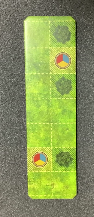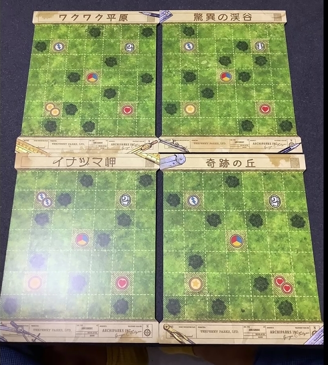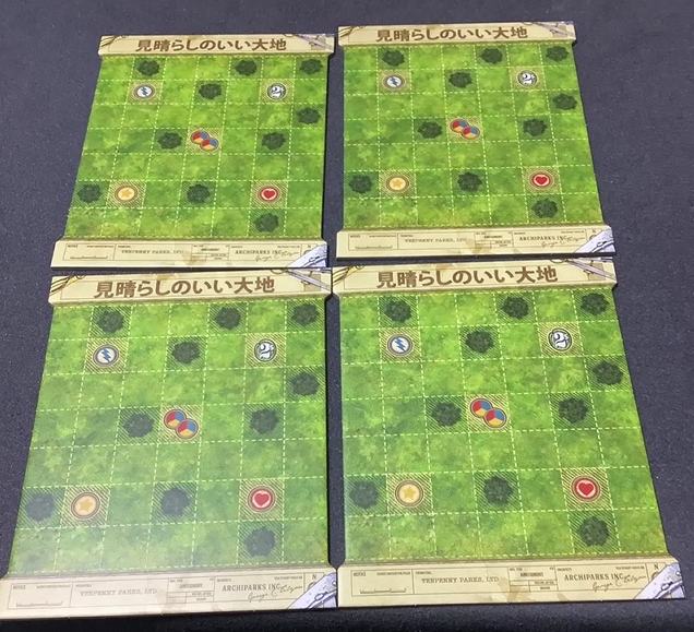 まず個人ボード、ごらんのように同じデザインのマップに緑色のところに木コマを置いてスタートします。