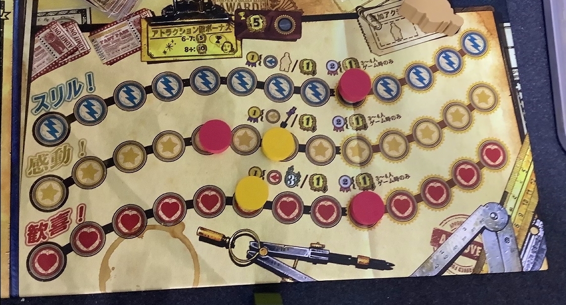そして客の感情を示すトラックです。ここも毎ラウンドボーナスで様々な得点がもらえます。一番右に駒が進んでいる人は