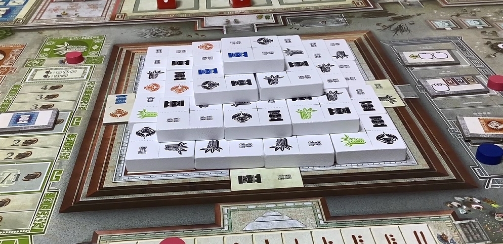 そしてビラミット建築と装飾。ここを完成してもゲームは終了に向かいます。四角いタイルもプラスチック製で手ざわりもいいです。