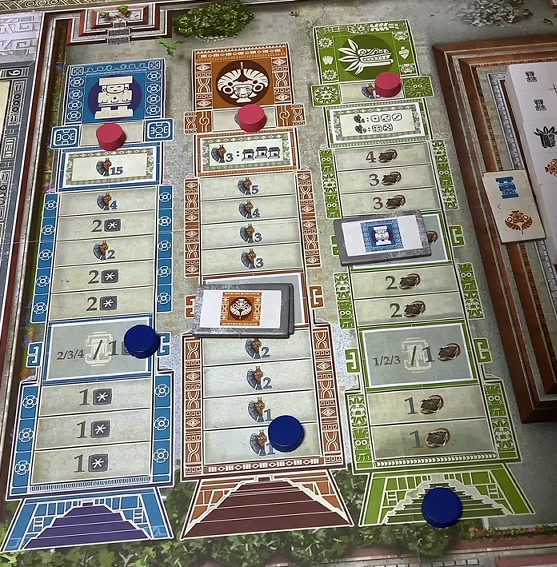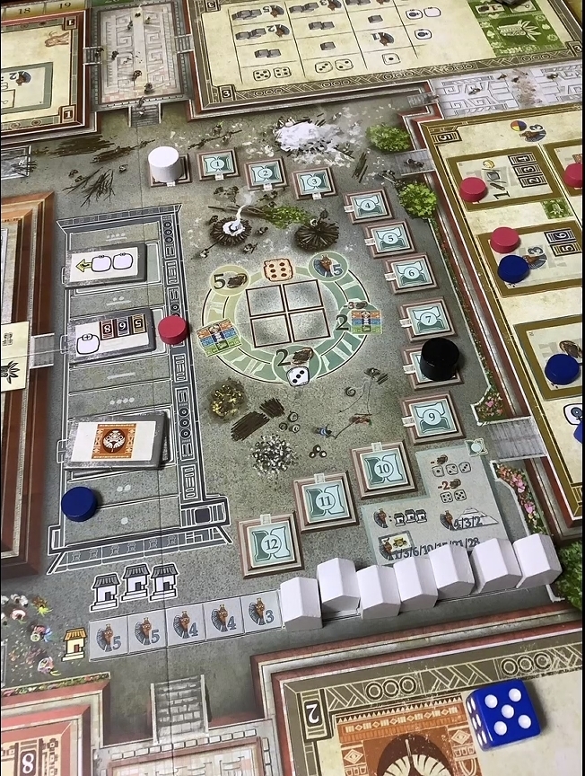 まずサイコロを使うゲームなのだが運要素が一切ない。ボードの周りをぐるぐる回りそこでアクションを行い、資源をとったり建設したり、技術を獲得したりできるが、ダイスの目が1つ上がってしまう。