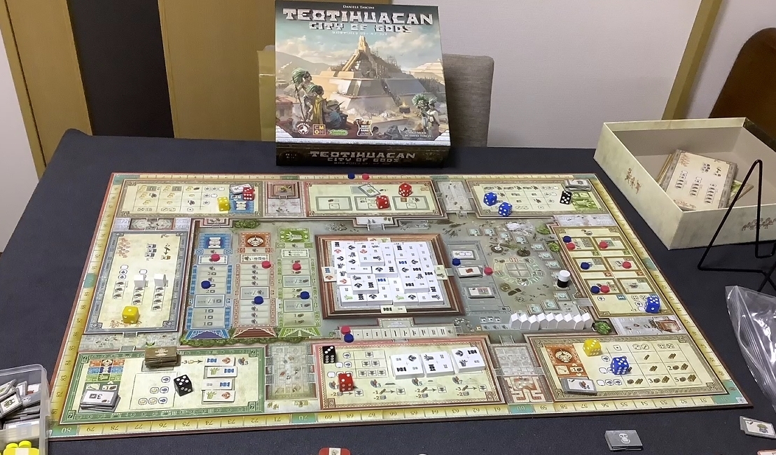 あとはソロモードがけっこうしっかり作っているみたいで、ちゃんと資源を獲得しますし、ちゃんとアクションしたり邪魔したりします。ただ、アクションによっては積極的にダイスを動かさないことがちょっと引っかかる印象はありますが、最後の強引な巻き返し方を見ると別にいいのかなと思えたりはします。