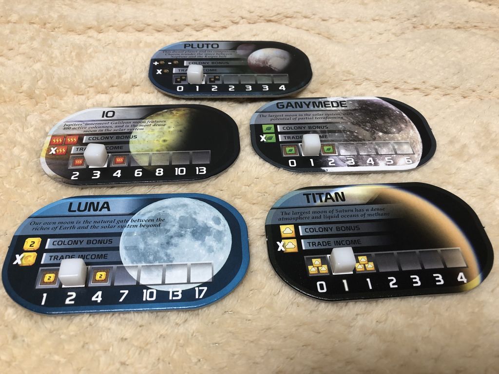 プレイ中に見るべきところが、手札・プレイ札・資源・相手の状況・地図・パラメータ・称号・褒章・金星ボードに5枚以上のコロニータイルが加わり、盤面はとんでもないボリュームだ!だが、それがいい。