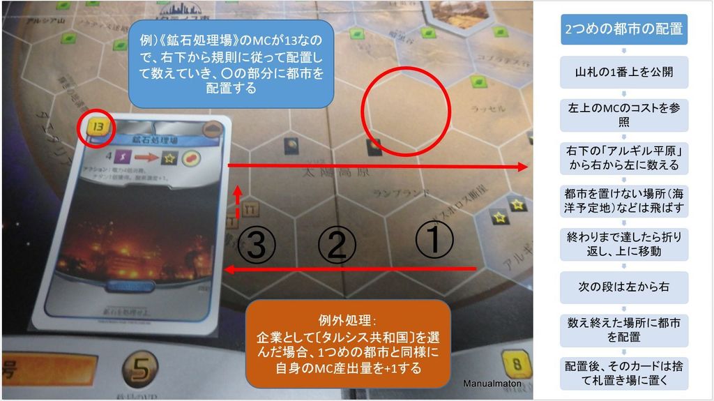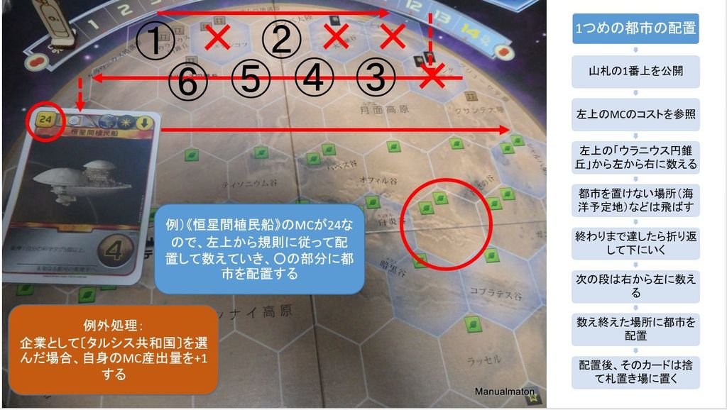 - 中立でありますが、「都市が配置された」ことに変わりはないので〔タルシス共和国〕を選んでいた場合に限り、MC産出量が+1ずつの都合+2された状態でゲームが開始します。