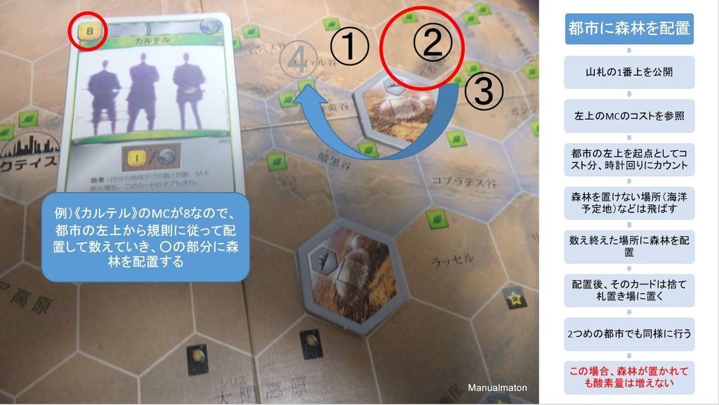 - 最初から森林2つが配置されていますが、酸素量は増えません。