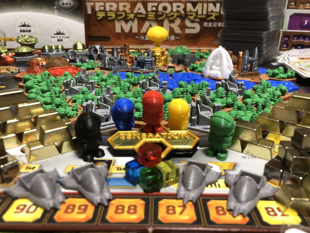 ・僅差で勝ち負けが決まるときも多く、『あそこでアレを先に取っていれば…!』『点数カードで追い上げて逆転勝利!』など最後まで盛り上がるポイント満載です。特に後半から終盤に駆けてのゲーム進行度合いはこのゲーム1番のオススメポイントです。終了時には盤面上の火星もテラフォーミングが完了し、緑や海、都市などで溢れかえっていることでしょう。ゲーム終了時の達成感と脱力感を味わってこそ重量級ゲームの醍醐味となります。
