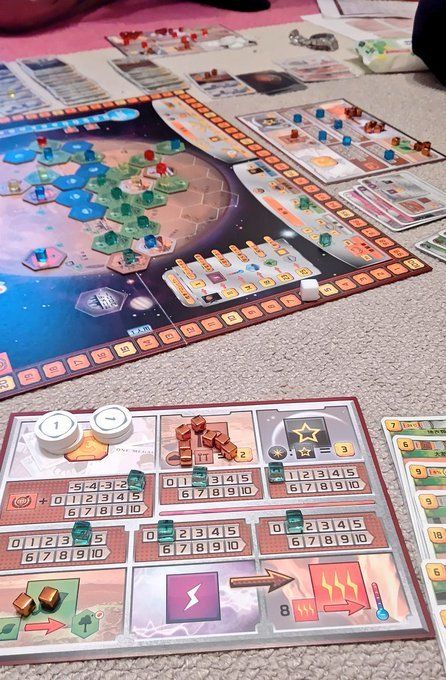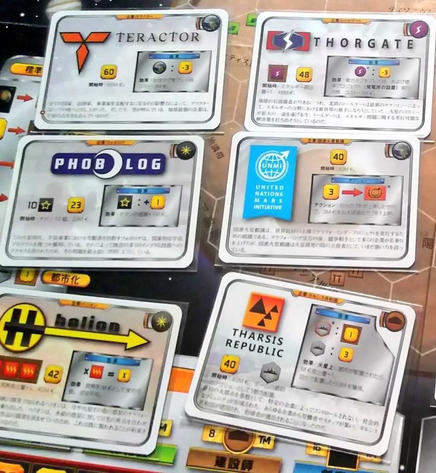 また、カードが多彩なのとランダム性が高いので時々の判断を迫られる企業代表者感もあり、はたまたマップにタイルを埋めたり、温度や酸素濃度のゲージを上げたりとテラフォーミングという偉業への道という世界観との親和性も高いのが好印象。企業カードや研究カードにもフレーバーテキストがあるのも雰囲気を補完してくれてグッド。