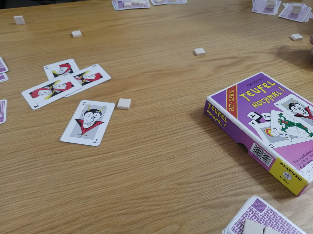 メイフォローで先出し勝ちでワニをいきなり出すとワニ連打されて取らされるから、出したくないけどカード枚数がワニが15枚、道化8枚、少女6枚、悪魔3枚となっていて、はじめからバラつきがあるのでワニ出しも必要。