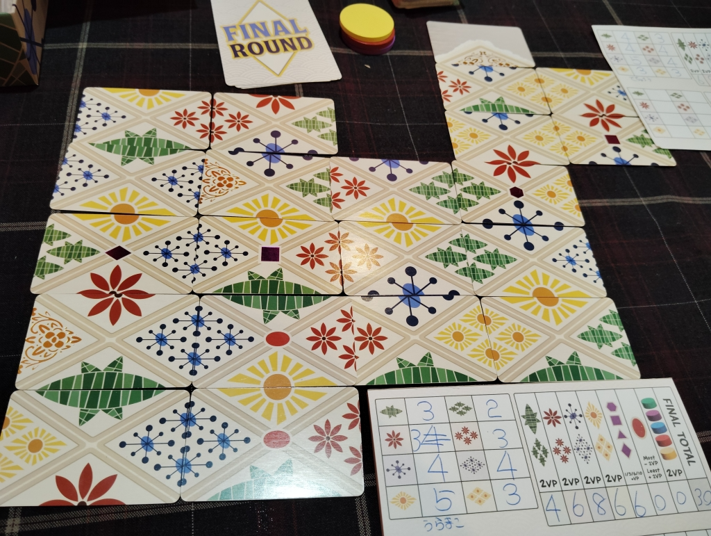 各色2種類の壁紙がどのぐらい完成しているかのセット得点や壁紙にあるアイコンセットコレクション、優先順位得点等の合計得点が高いプレイヤーの勝ち。