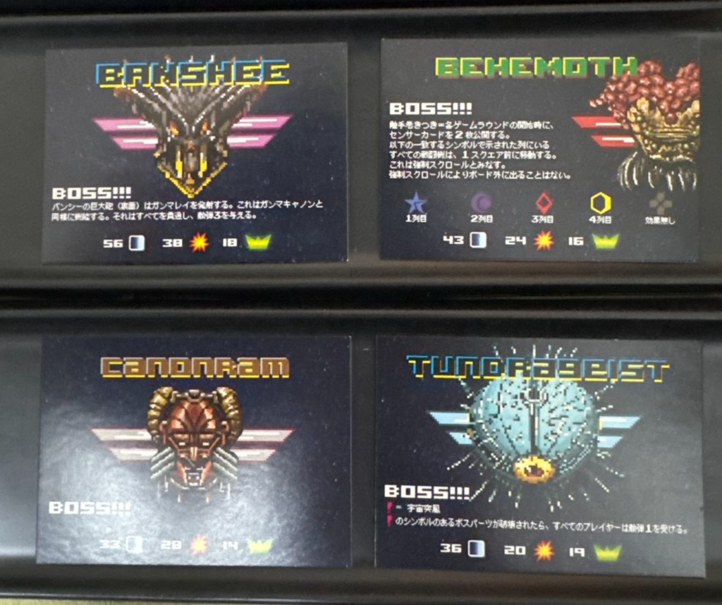 スクロールなので、全員が1手番終えると画面が流れていき、新しい敵や障害物などが前面から出てきます。敵機を倒すとお金や勝利点がもらえるので、このお金を使ってパワーアップアイテムを購入して自機を強化してボスに挑む感じですね。この辺グラディウスとかに近いシステムなので、イメージしやすいかと思います。