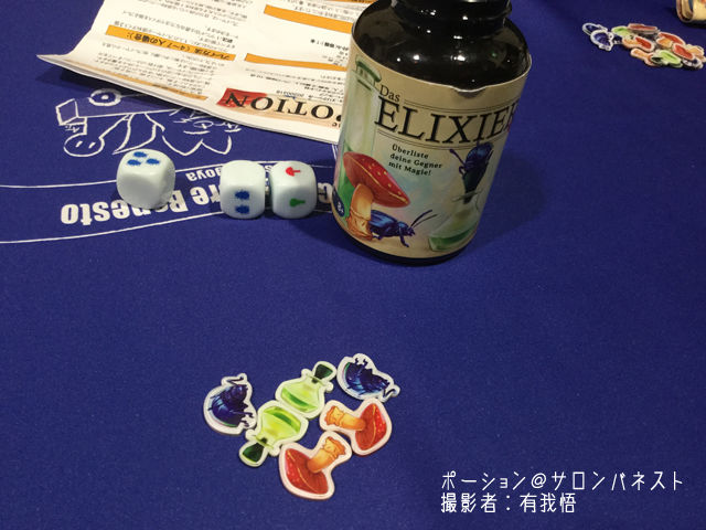 薬を作る為に持っている材料を、1~3の目が出るダイスを3つ振り、その目に合わせて材料1つを握りこんで出します。数をぴったりそろえることが出来たら瓶の中に材料を入れて手元に残った材料が一種類のみになったら勝ち、と言うゲーム。