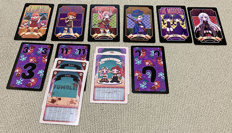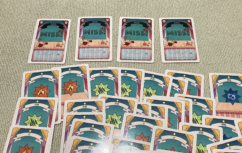 それぞれ同時に1枚ずつめくっていく。MISSやFUMBLEが2枚出たら脱落。