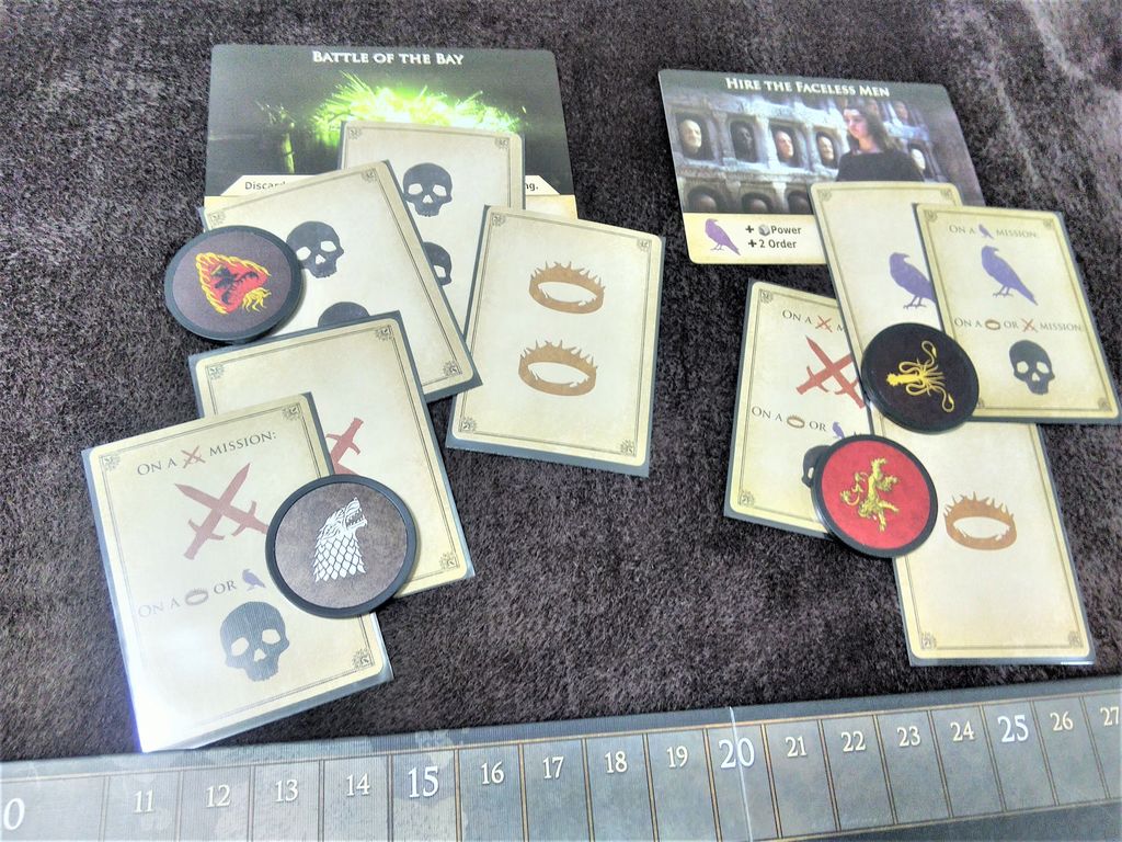 次は、各プレイヤーは順番でミッション・カードのところに手札から影響カードを合計2枚以上伏せて置きます。そして、自分のカードが最も多く置いてあったクエストに家紋コインを置きます。(1ー1に分けて置いた場合、コインはどちら置くか選べます。)