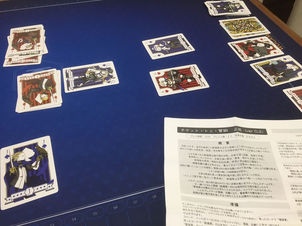 トランプを使って、三国志をテーマにした2人協力ゲームです。曹操軍を模したカードが1枚ずつめくられるので、それを2人で協力して少し弱めのカードを1枚ずつ出して打倒していきます。