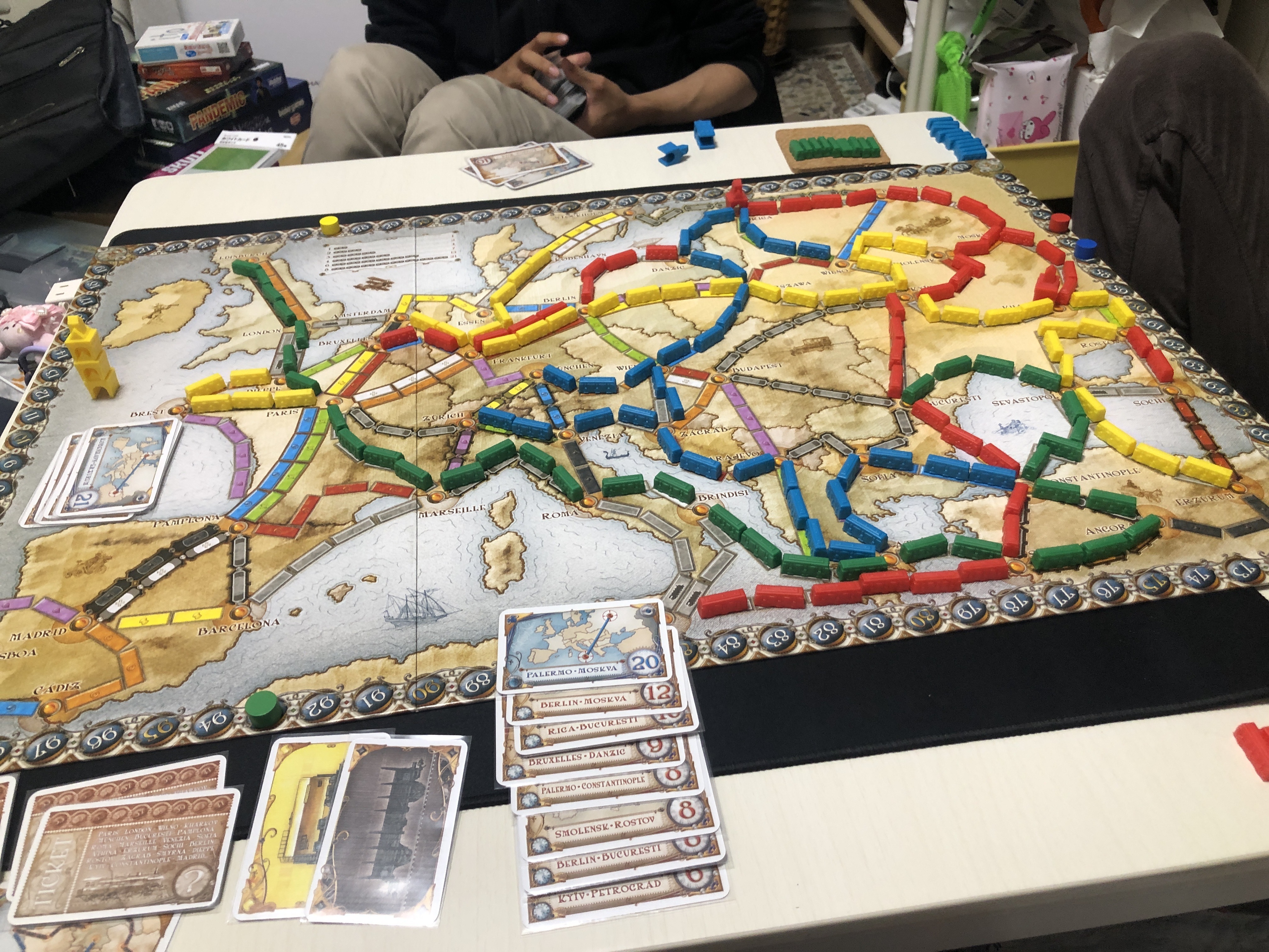 ゲーム開始時に配られた行き先チケットを開通させていくゲーム。開通出来なったチケットはそのままマイナスに転じてしまいハイリスクハイリターンで行くか悩ましいところ。アメリカの続編ですが、あちらと違い長距離チケットは別口で用意されているのと駅システムが導入されたことにより、チケット未開通での大爆死による大敗が減りアメリカの苦しい点が改善された印象。SLの使用を求められる路線やトンネルが新しく追加されており手札の厚みが重要だった前作よりも手札の枚数は重要になった気がする。とはいえ運と実力のバランスが程よく初見の人でも良い勝負になったりと初めての中級クラスのゲームとしてはとても良い作品だと思う。