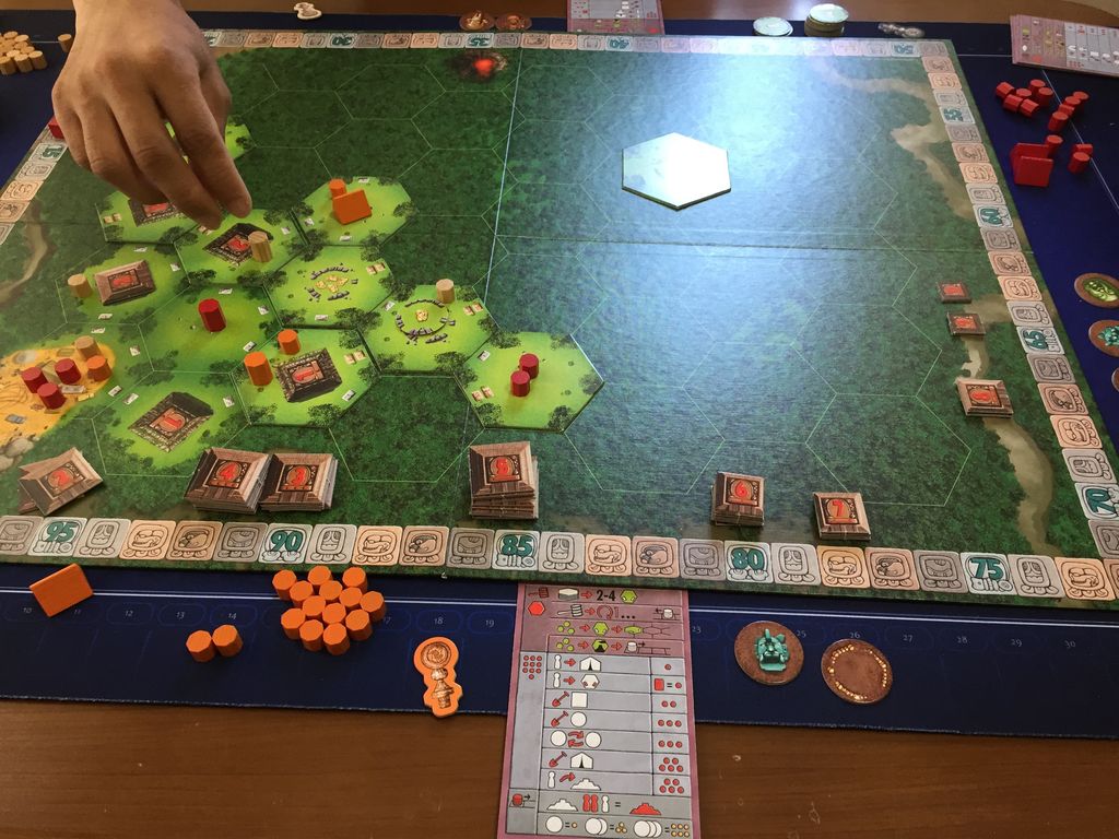 こちらは、ラウンド毎に区切って、六角形のタイルを人数分めくって、競りを行います。競りに勝ったプレイヤーが自由にタイルを選んで配置して手番を行います。通常ルールであれば、タイルの山から引いて配置するので、より一層順番が重要になります。